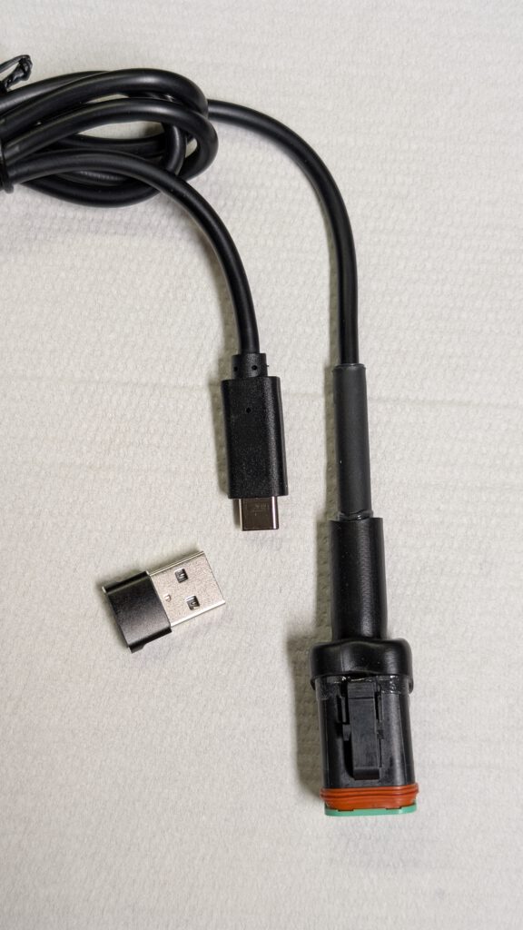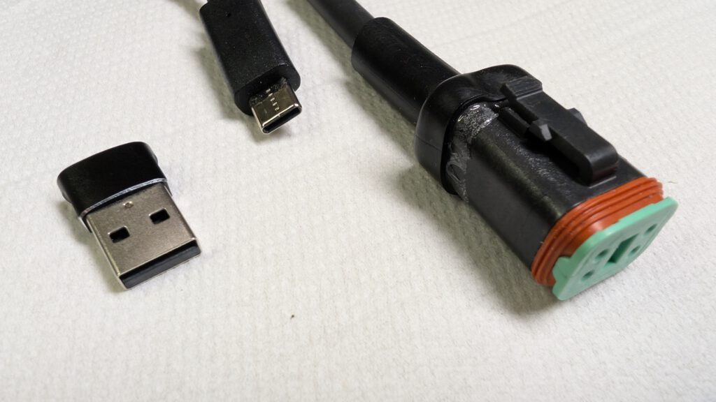 Das Diagnosekabel wird in die originale Diagnosebuchse der BUELL eingesteckt und dann an einem freien USB-C-Port oder mit dem beiliegenden Adapter mit einem USB-A-Port am Endgerät verbunden.